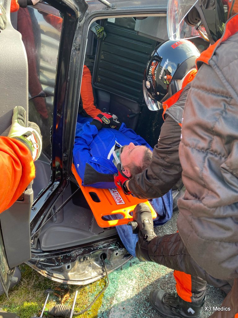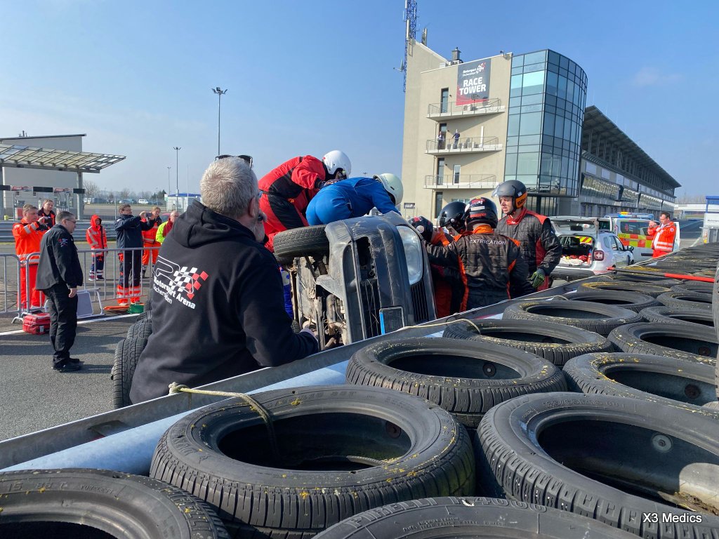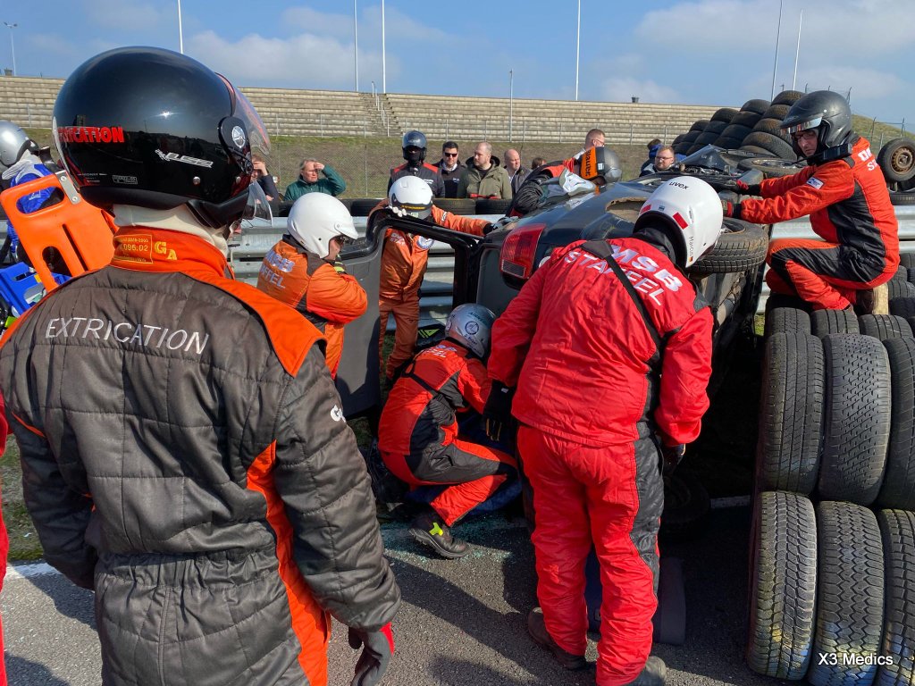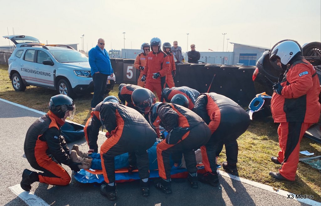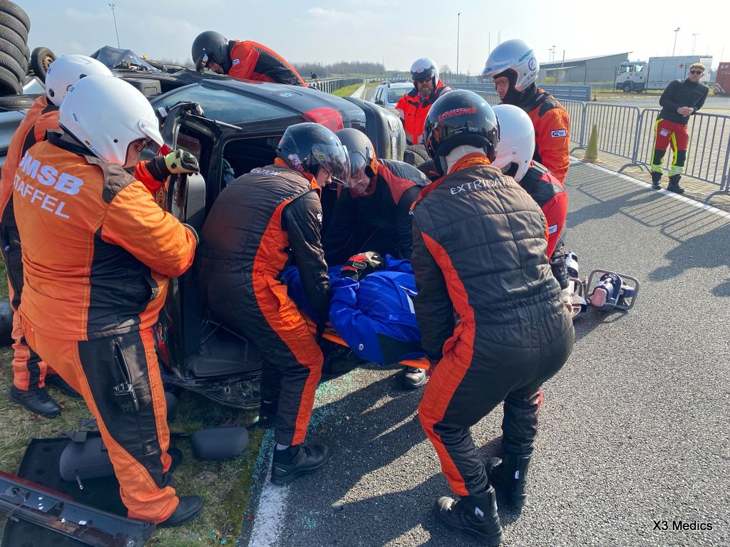 Nach erfolgreicher Zertifizierung fanden am Sonntag zwei realistische Szenarien statt. Hierbei konnten alle Services ihr erlerntes Wissen vom Wochenende abrufen. Medical Car, DMSB Staffel, Medizinische Einsatzleiter, Leitende Rennärzte und die drei Extrication Teams arbeiteten hervorragend zusammen und konnten die verletzten Fahrer sicher und schnell aus den Fahrzeugen befreien.