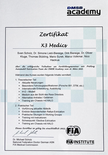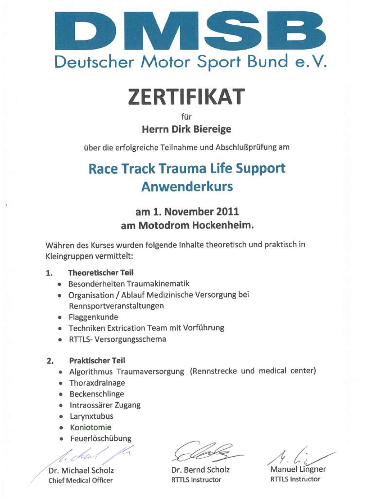Erfolgreiche Teilnahme von Dirk Biereige am Race Track Trauma Life Support (RTTLS)- Kurs des DMSB