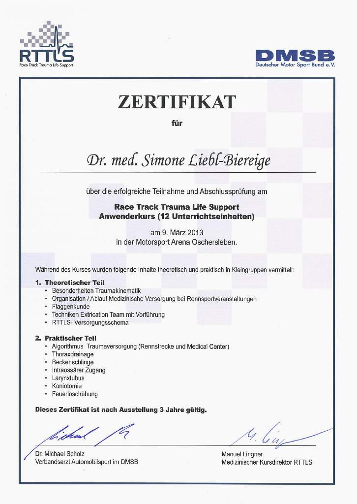 Erfolgreiche Teilnahme von Dr. Liebl- Biereige am Race Track Trauma Life Support (RTTLS)- Kurs des DMSB